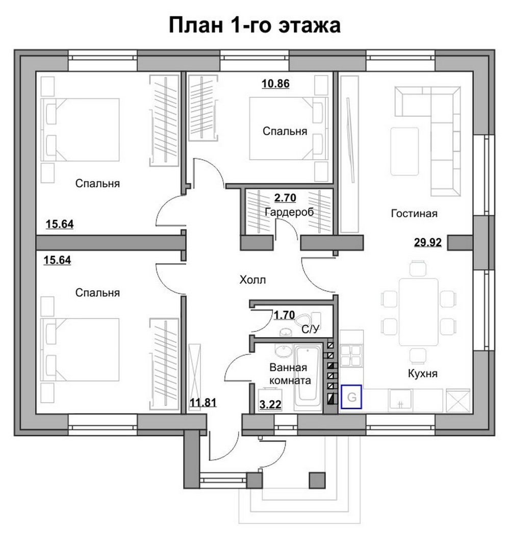 В этом коттедже есть все необходимое: просторная кухня-гостиная, которая по Вашему желанию может быть разделена на две смежные зоны, три полноценных спальни и огромная ванная комната. Отдельная гардеробная комната может быть переоборудована в еще один санузел.