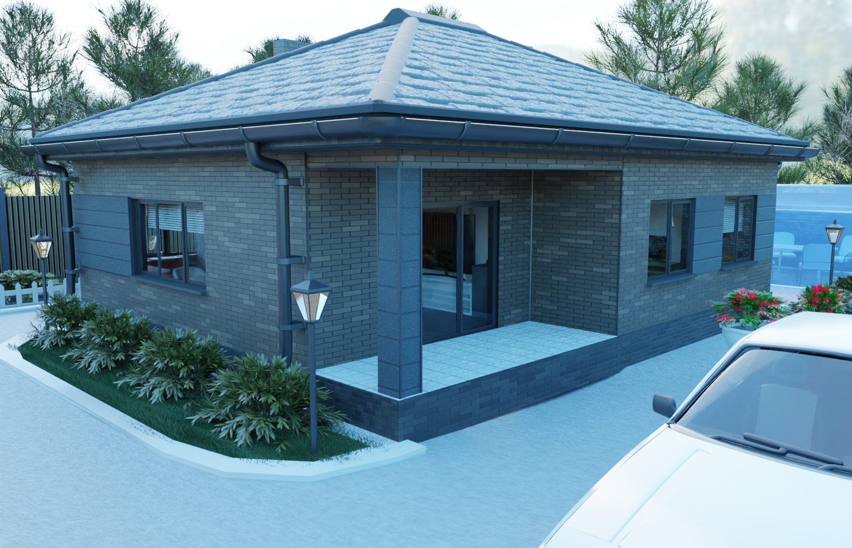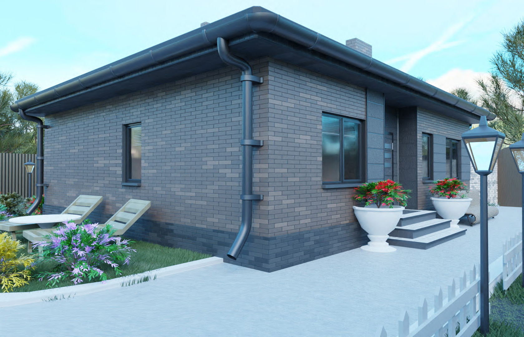 В этом коттедже есть все необходимое: просторная кухня-гостиная, которая по Вашему желанию может быть разделена на две смежные зоны, три полноценных спальни и два санузла. Один из санузлов может быть переоборудован в кладовую или гардеробную комнату. Наличие открытой веранды выгодно отличает его от других проектов.