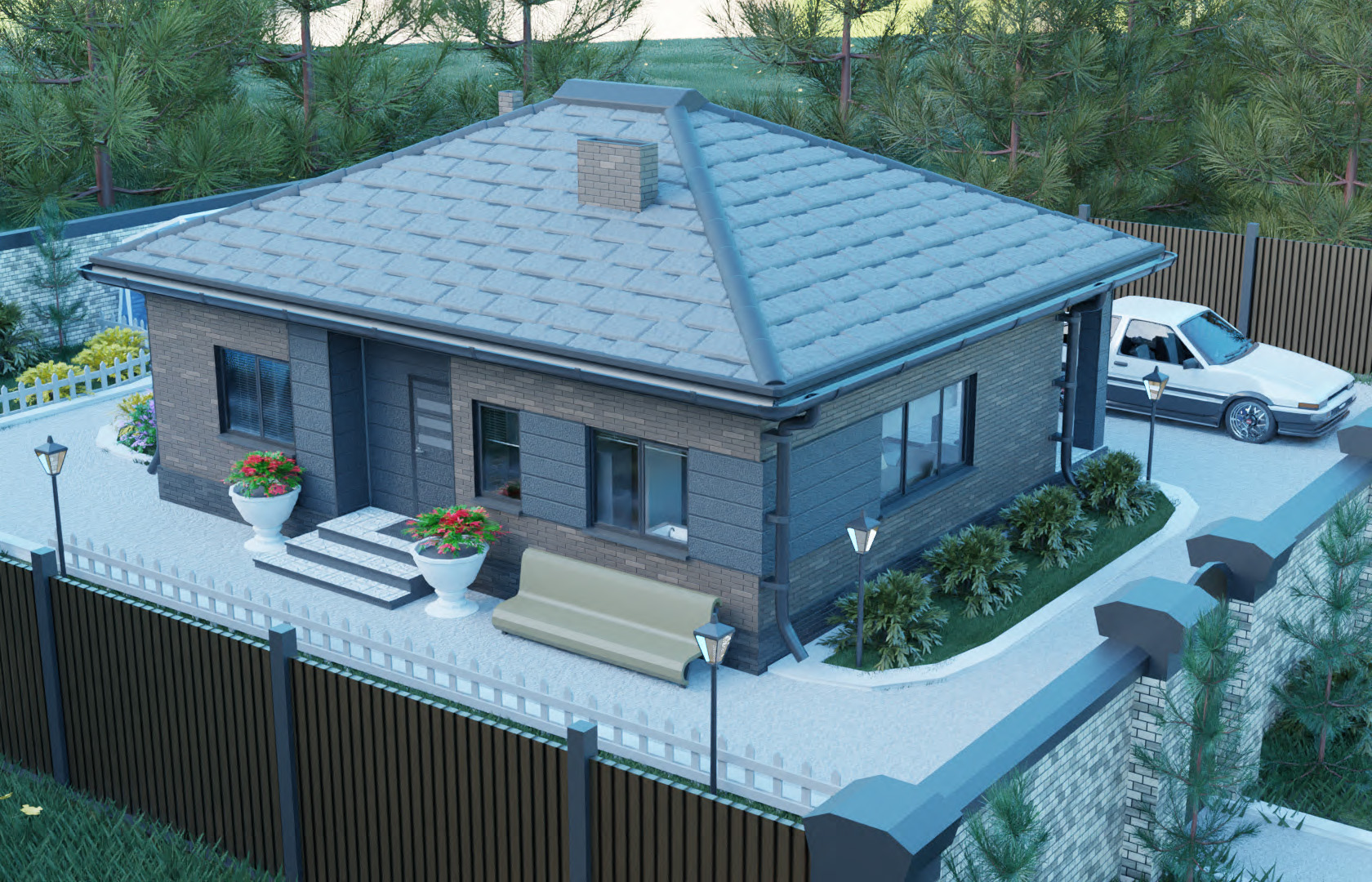 В этом коттедже есть все необходимое: просторная кухня-гостиная, которая по Вашему желанию может быть разделена на две смежные зоны, три полноценных спальни и два санузла. Один из санузлов может быть переоборудован в кладовую или гардеробную комнату. Наличие открытой веранды выгодно отличает его от других проектов.